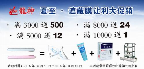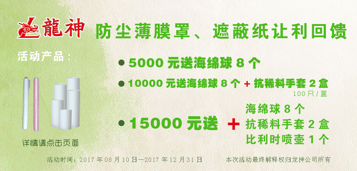 夏季讓利大回饋,遮避膜優(yōu)惠大促銷 2015-06-05 29667 買滿3000元,贈(zèng)送紙漏斗500個(gè); 買滿5000元,贈(zèng)送除漆洗手膏1箱; 買滿8000元,贈(zèng)送標(biāo)準(zhǔn)抹塵布1箱/24盒; 買滿10000元,贈(zèng)送小切紙架1臺(tái) 。