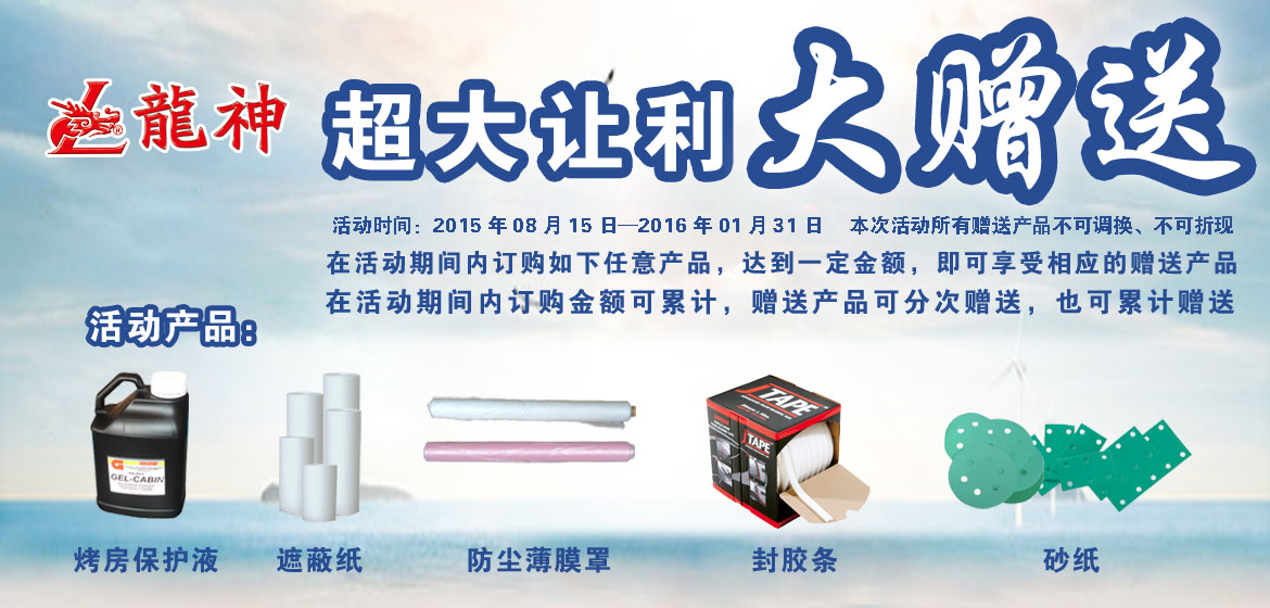 超大讓利﹒大贈(zèng)送 2015-08-17 31329 訂購產(chǎn)品:1、烤房保護(hù)液; 2、遮蔽膜; 3、遮蔽紙; 4、泡沫膠條; 5、砂紙。 在活動(dòng)期間內(nèi)訂購如上任意產(chǎn)品,達(dá)到下表累計(jì)金額,即可享受相應(yīng)的贈(zèng)送產(chǎn)品。